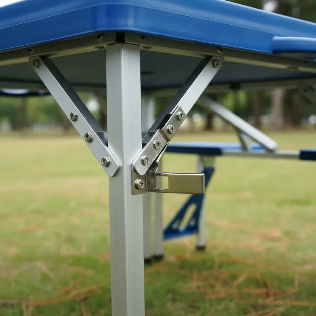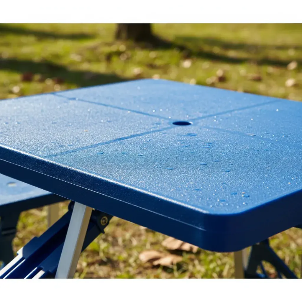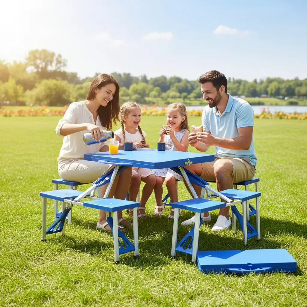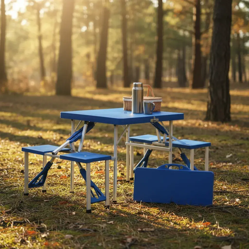 Mesa plegable y transportable para camping con 4 bancos integrados, diseño tipo valija para llevarla a donde quieras sin esfuerzo.